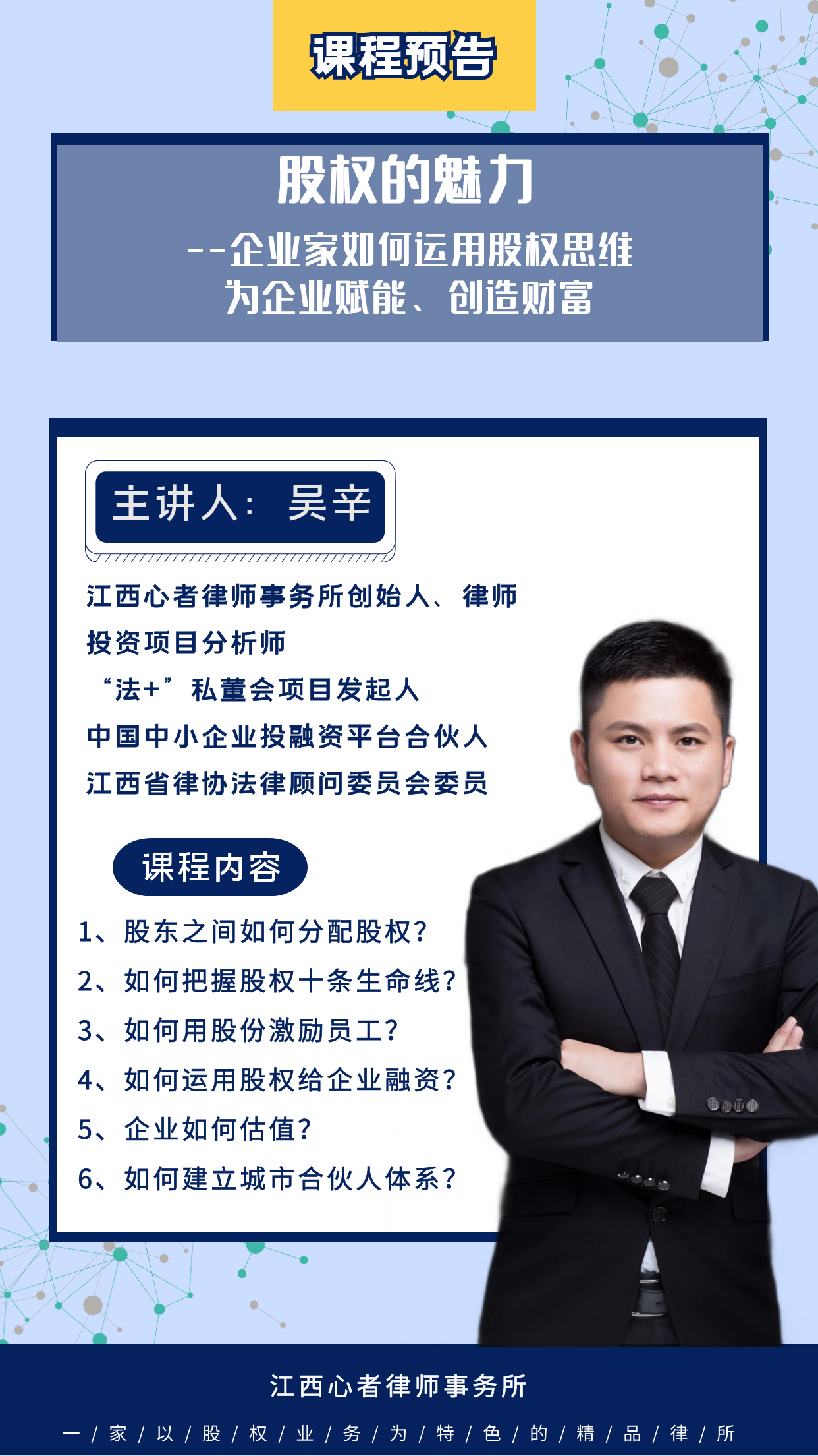 课程的最后,吴主任表示,心者律所作为一家专注股权业务的精品律所,在传播股权知识的同时,可以为企业提供股权架构设计、股权激励、股权融资、股权战略、股权清算、上市辅导等专业股权服务。